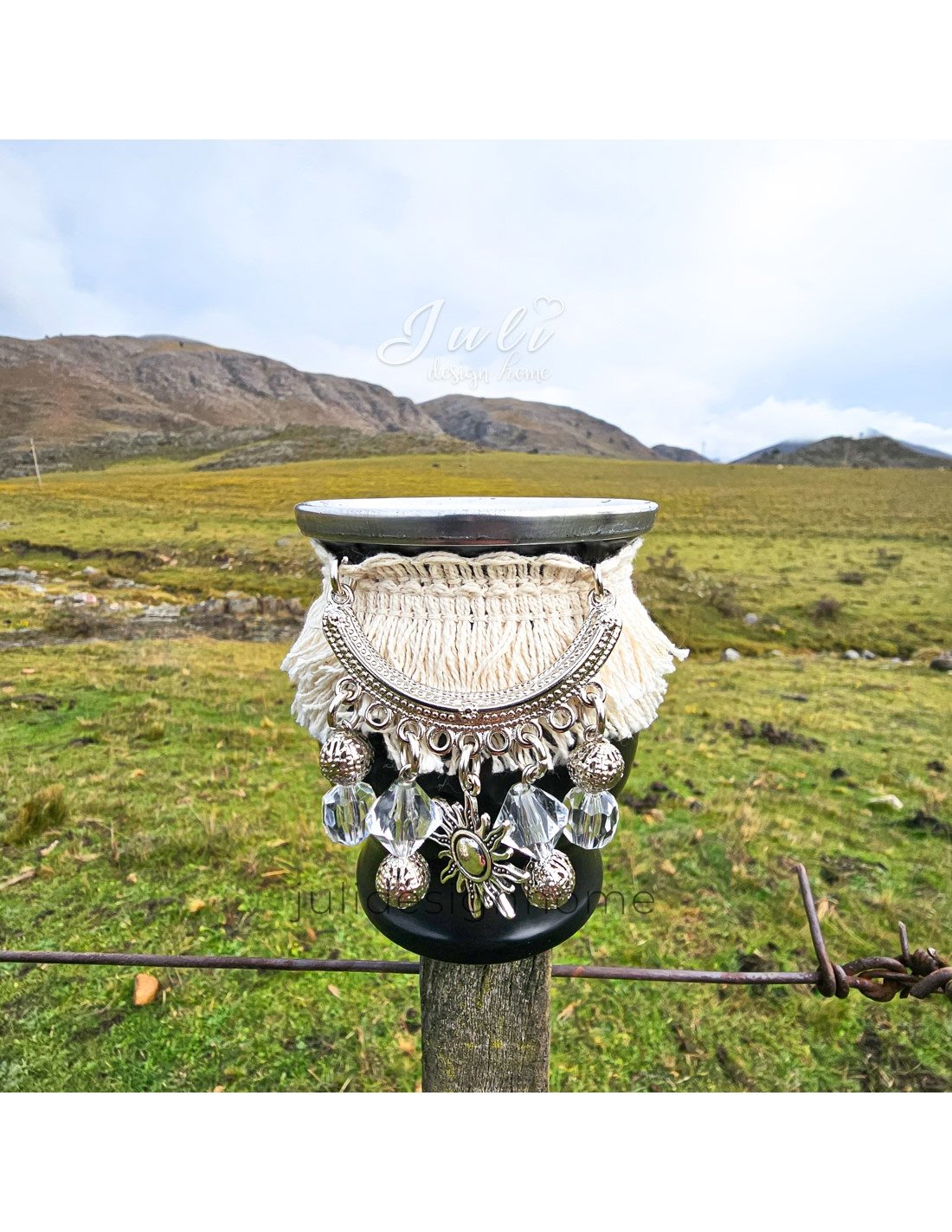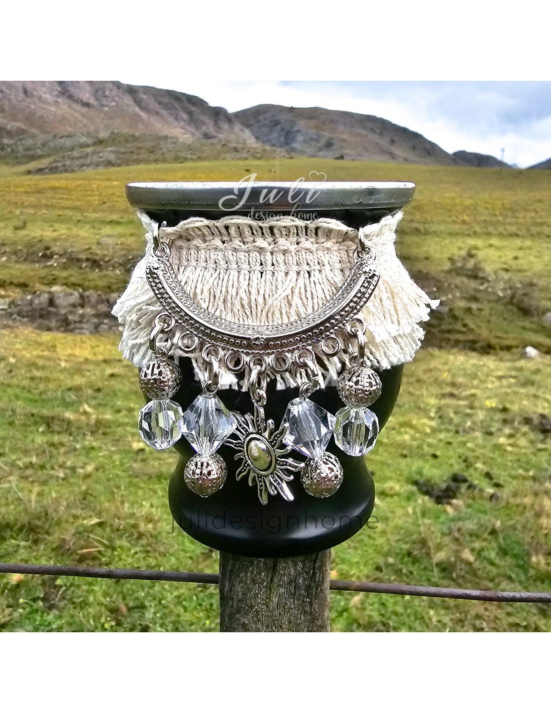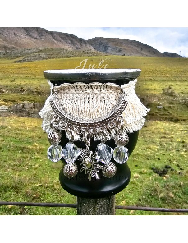 La decoración boho del mate es realmente única, y es ideal para aquellos que buscan un mate con personalidad. Los flecos de tela de algodón y los detalles de bijou le dan un toque de distinción que no pasará desapercibido en ninguna reunión o evento en el que lo utilices.