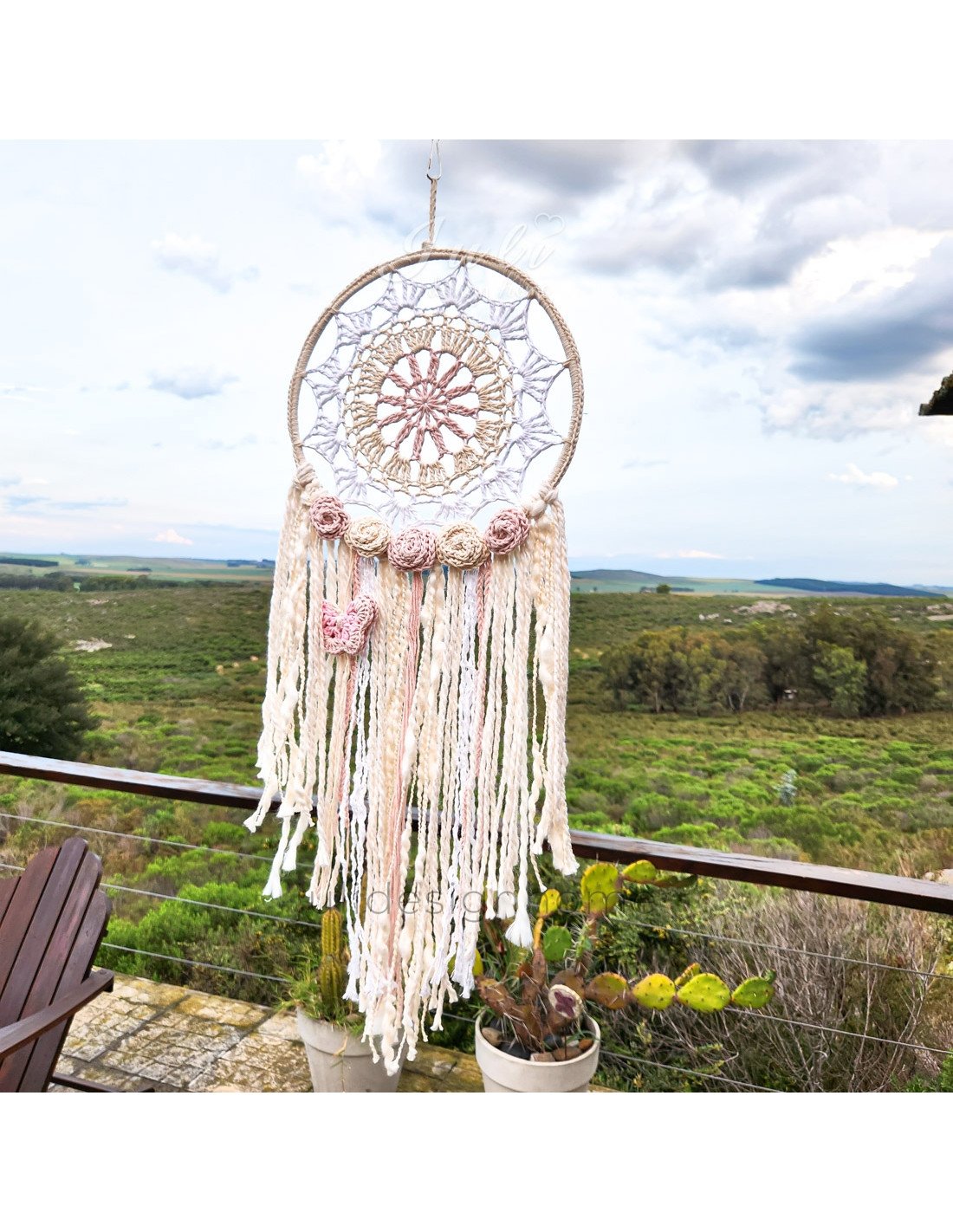 Atrapasueños Virgina tejido al crochet en tono natural y blanco.