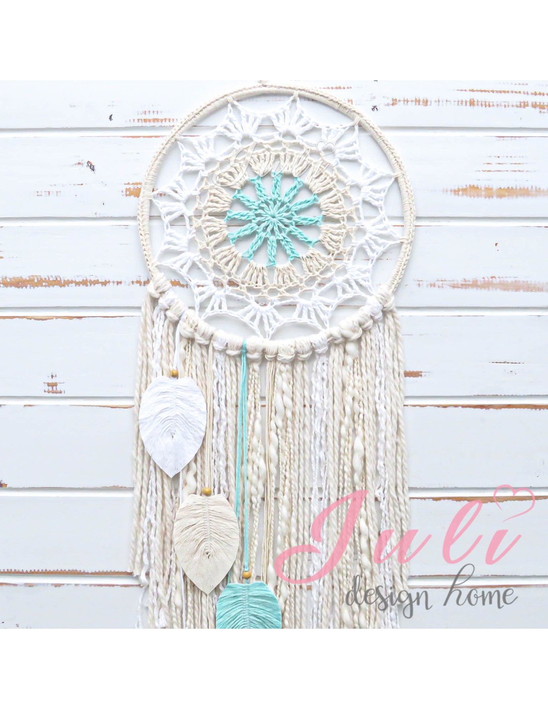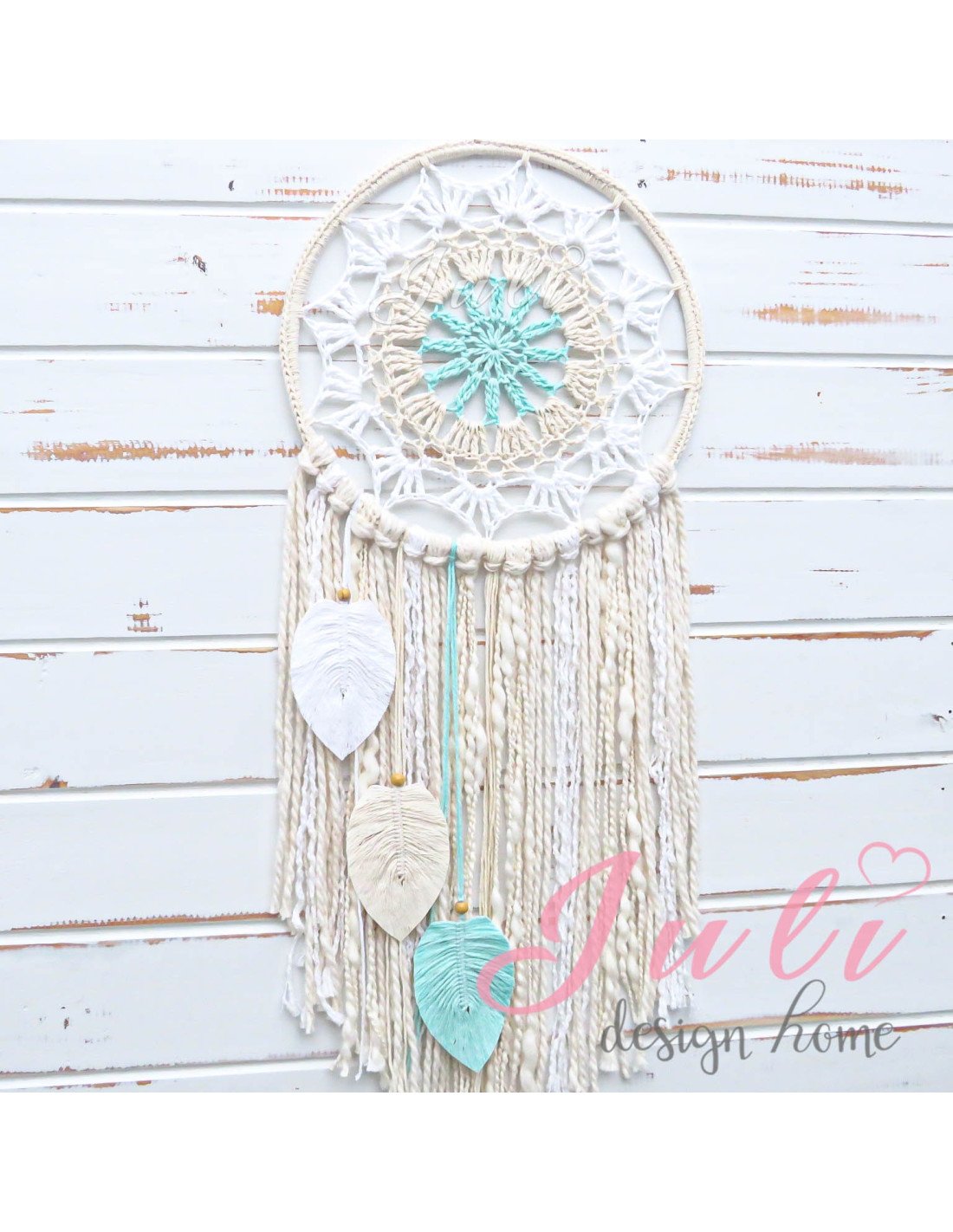 Atrapasueños tejido al crochet en tono rosa, natural y blanco.