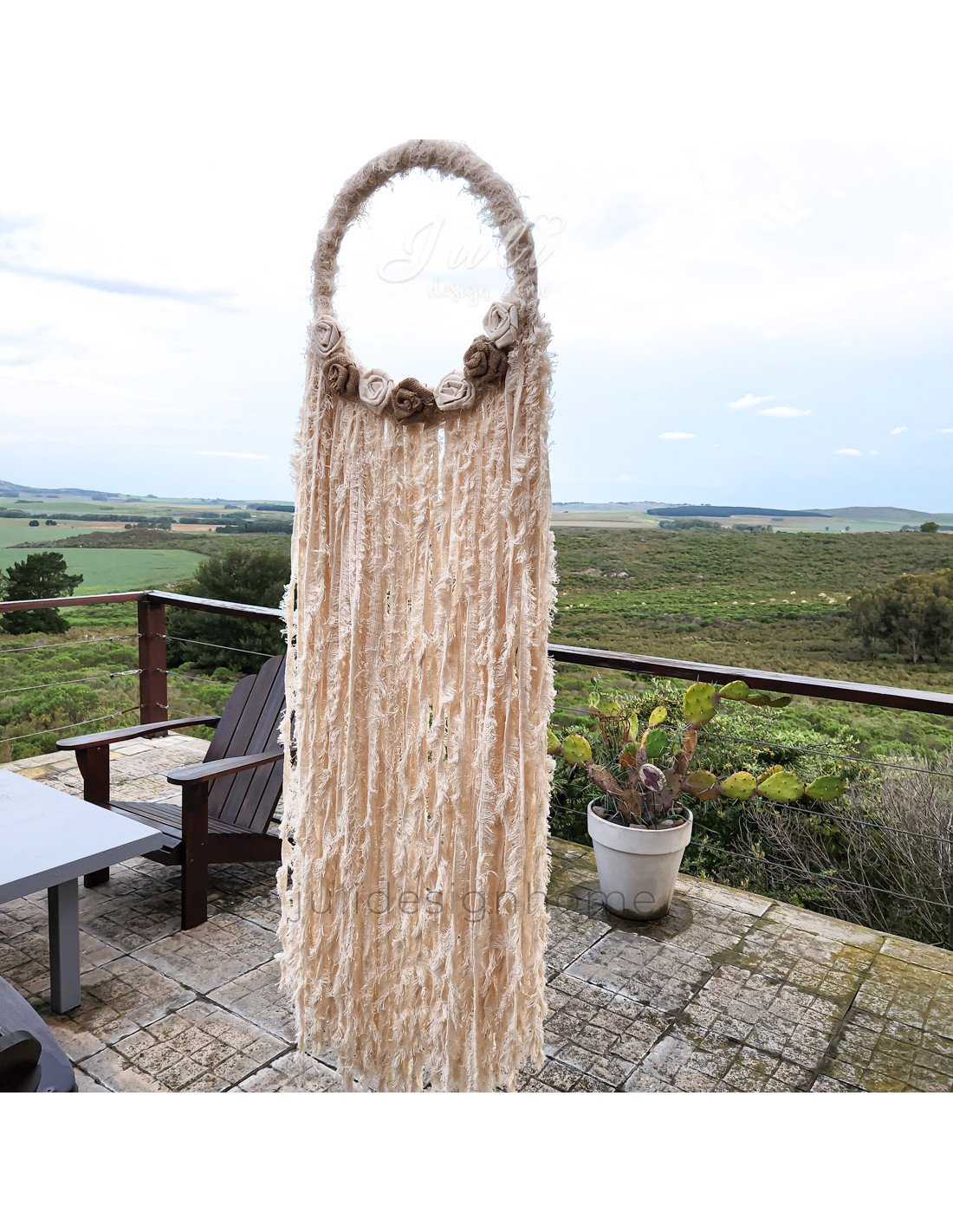 El aro del atrapasueños Jazmín está decorado con una rosa de tela en color natural y arpillera. Esta combinación de materiales añade un toque rústico y vintage al diseño, lo que lo hace perfecto para un estilo de decoración rústico o boho.