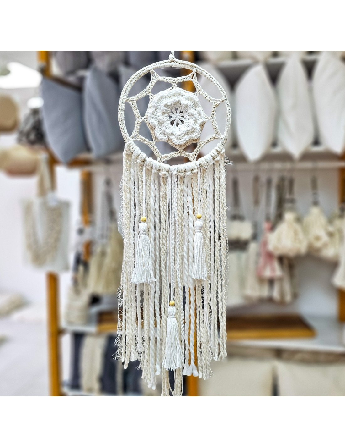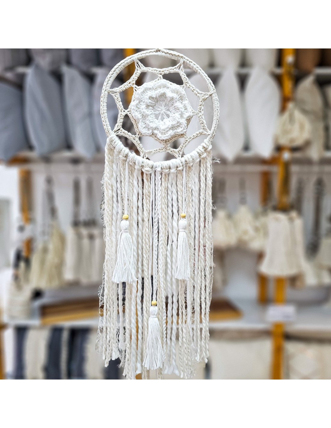 Atrapasueños tejido al crochet en tono blanco y natural.