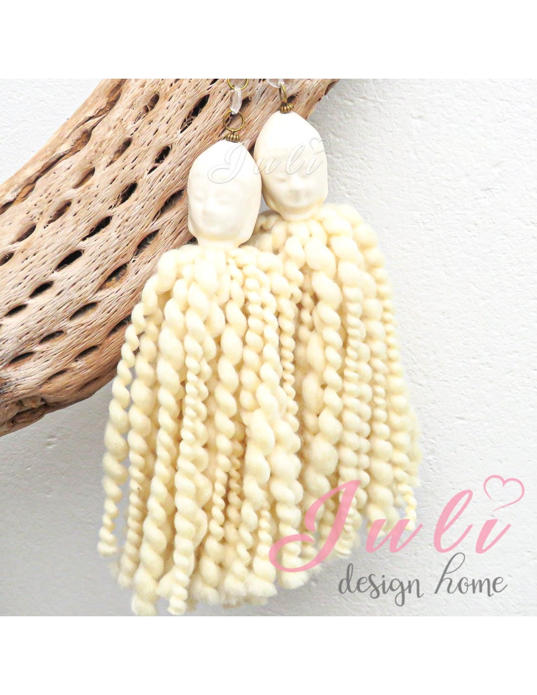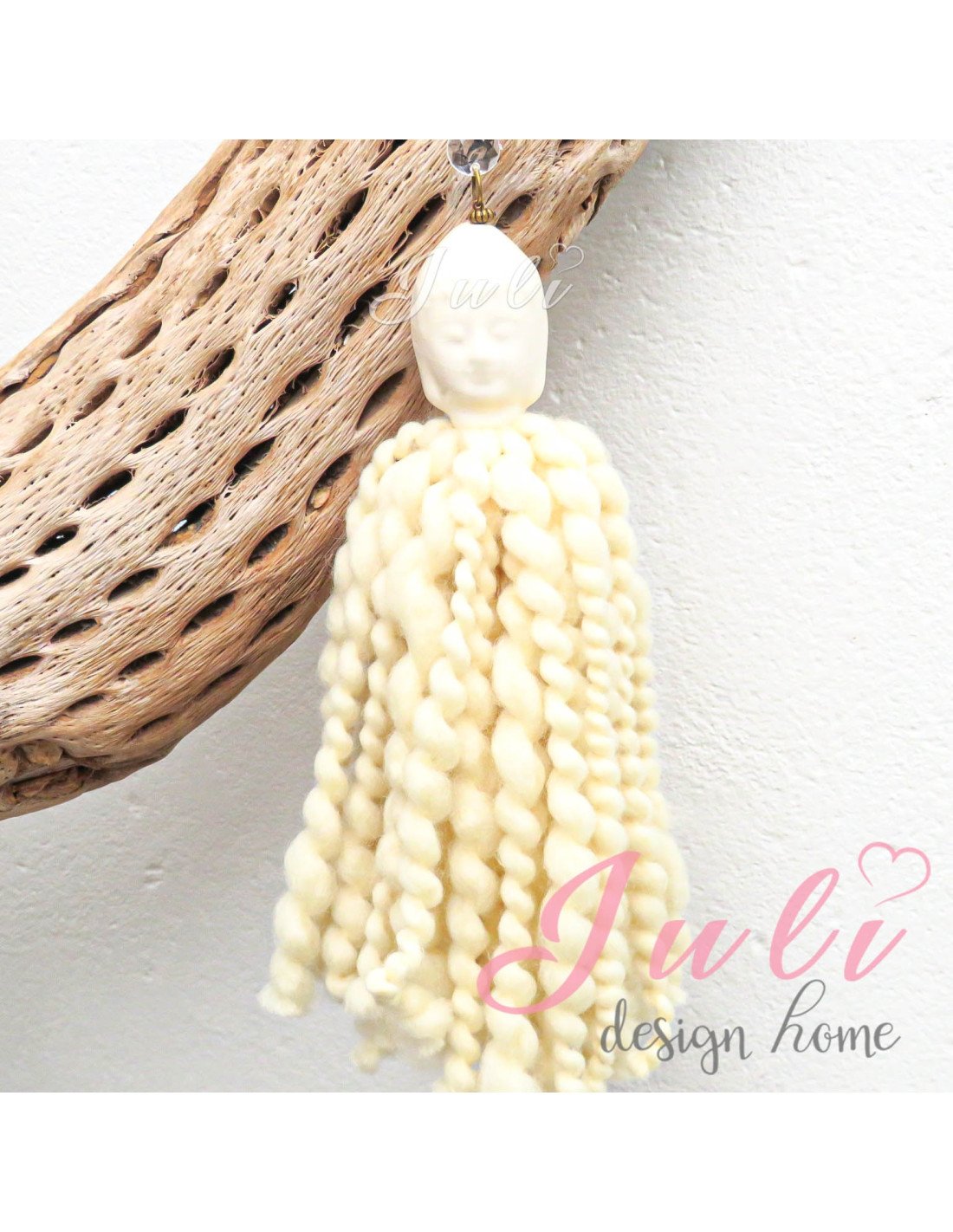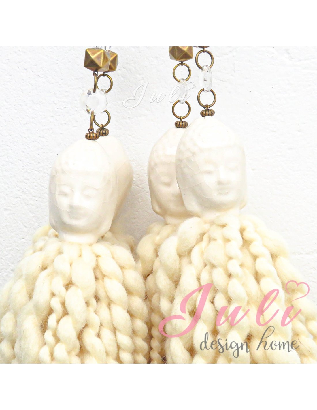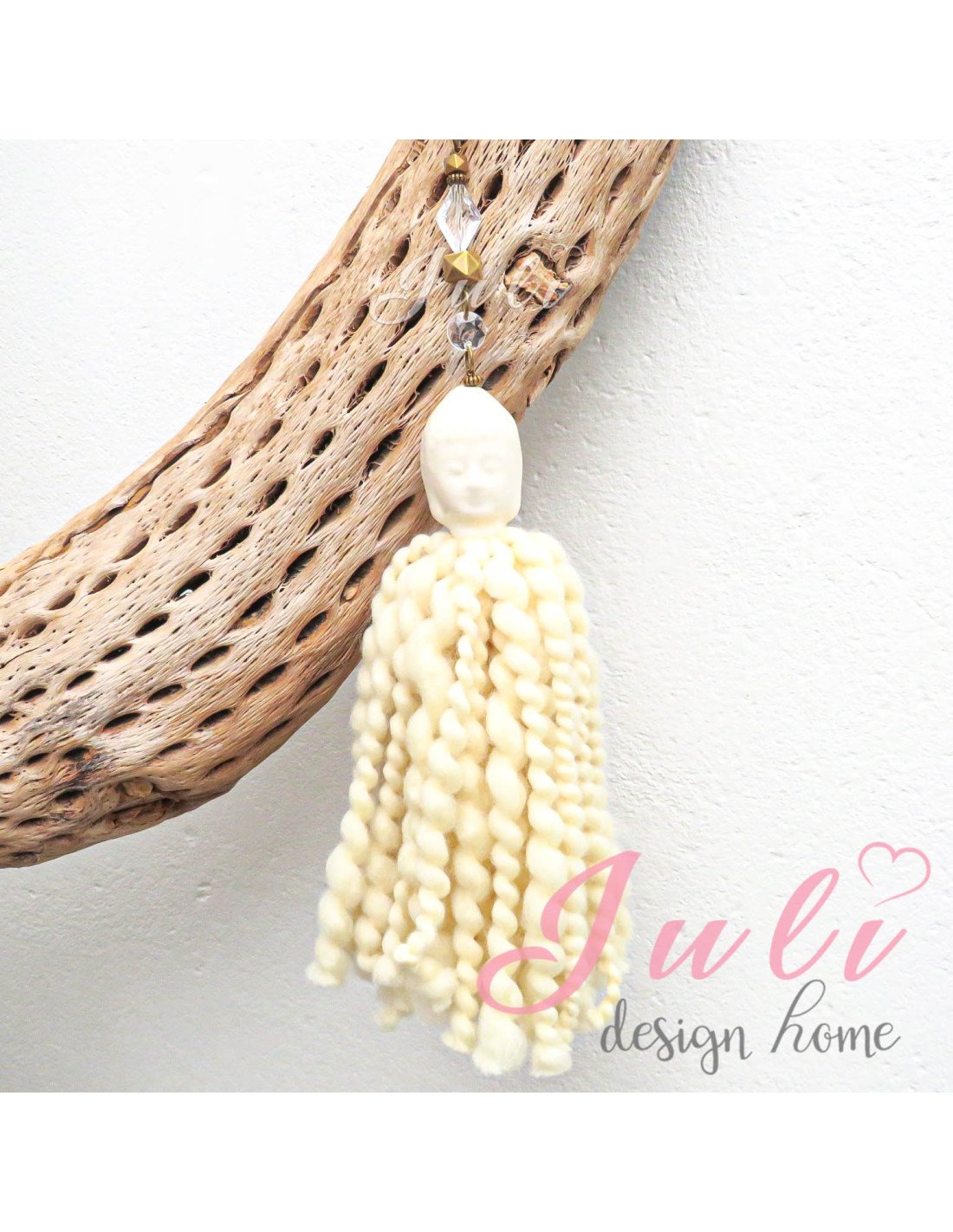 Borla decorativa diseñada con lana color natural y la imagen de buda en cerámica.