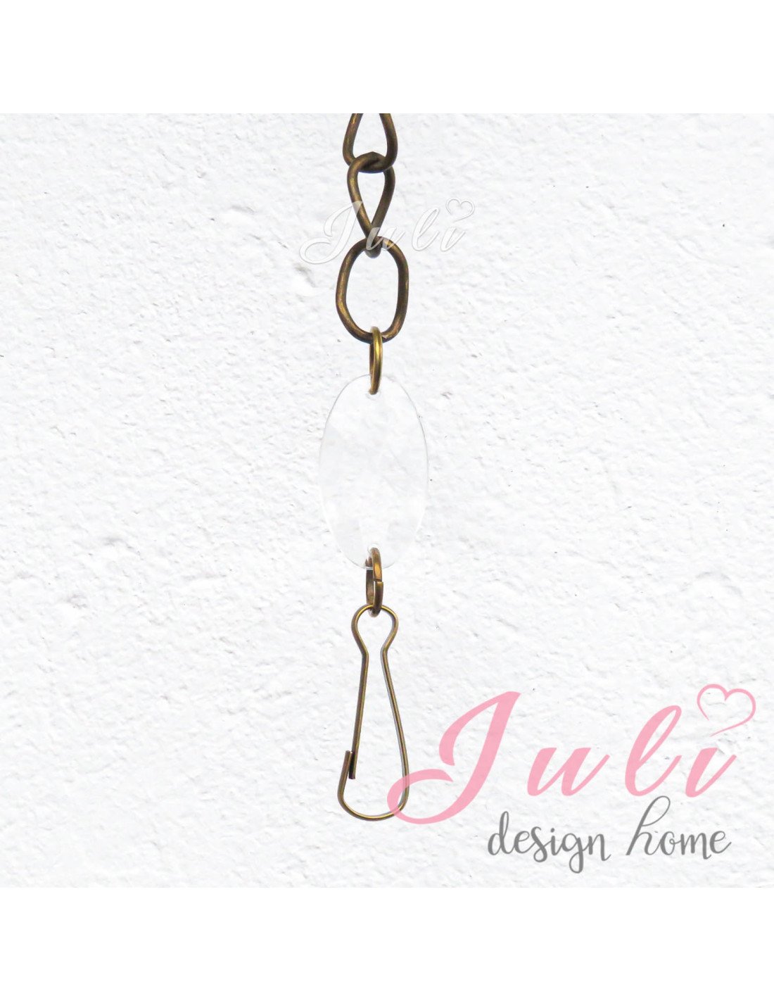 Tiene cadena regulable con mosquetón y aro metálico para colgar en el picaporte.