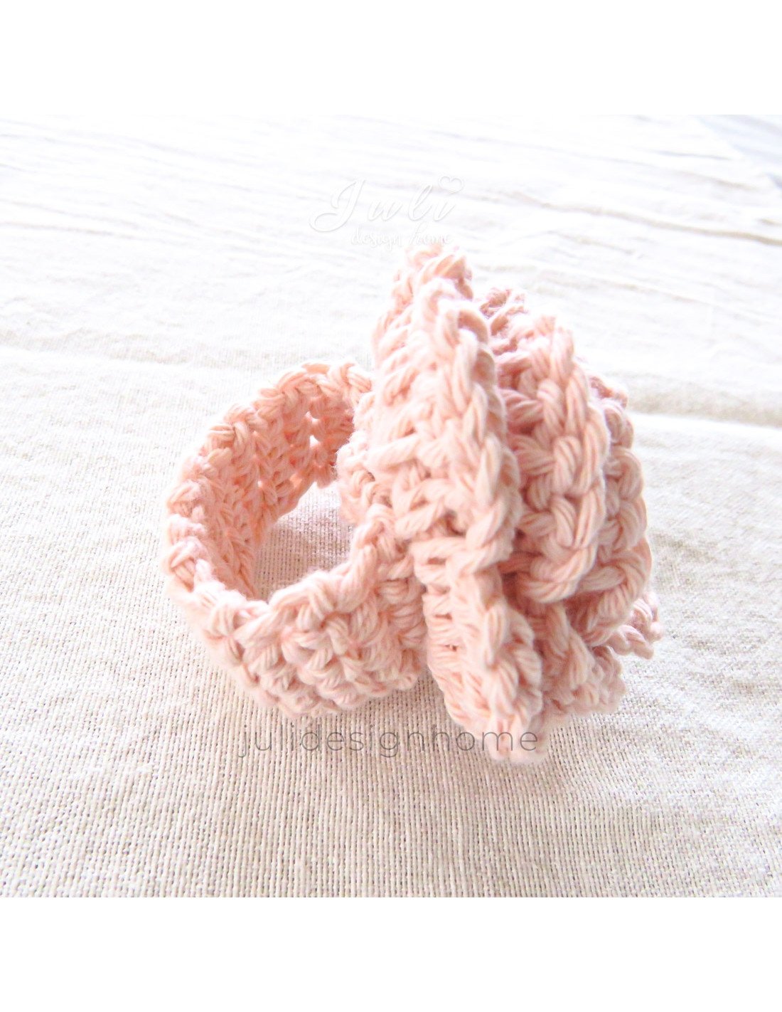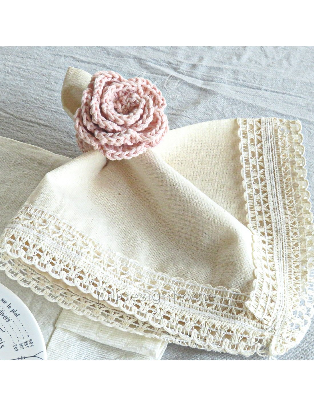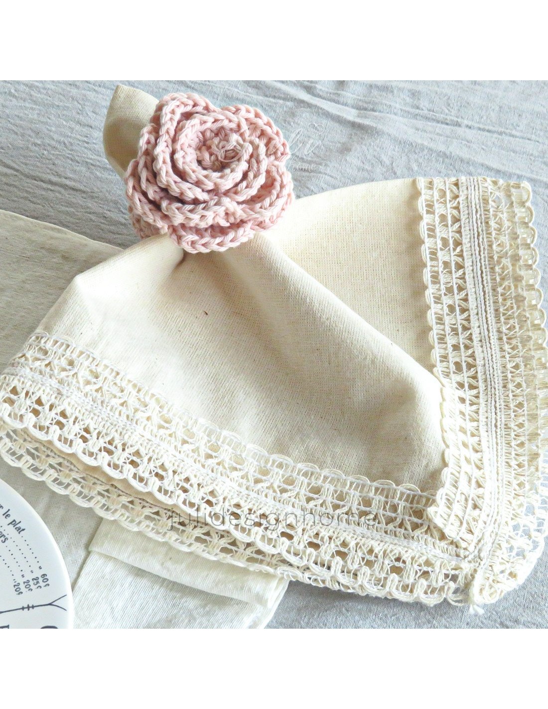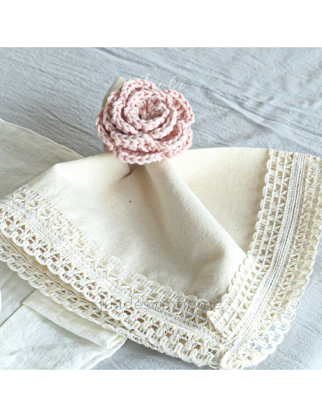 Cada servilletero está meticulosamente tejido a mano con hilo de alta calidad en un tono suave de rosa, evocando la belleza y la frescura de una rosa en plena floración. La forma detallada de una rosa, con sus pétalos, brinda un aspecto realista y cautivador.