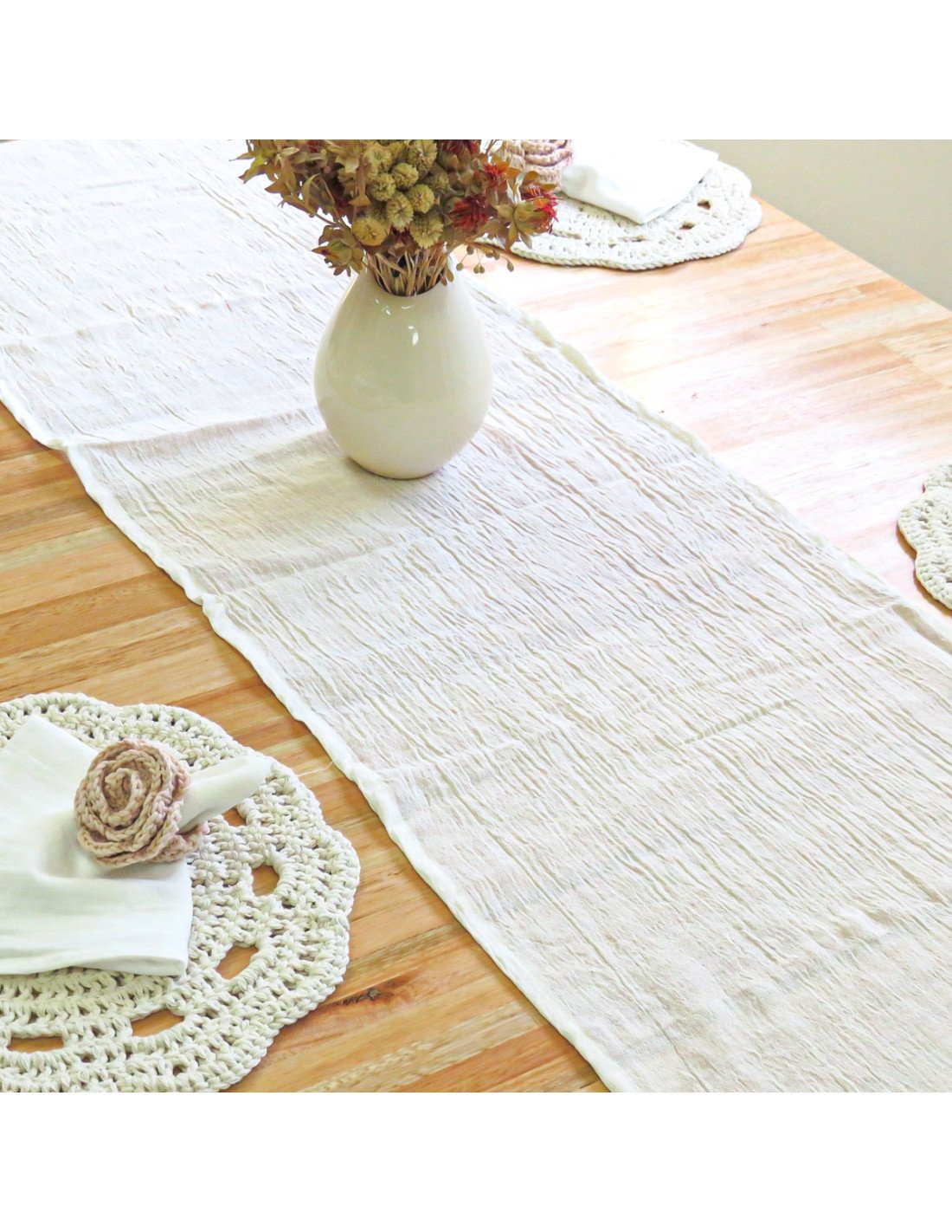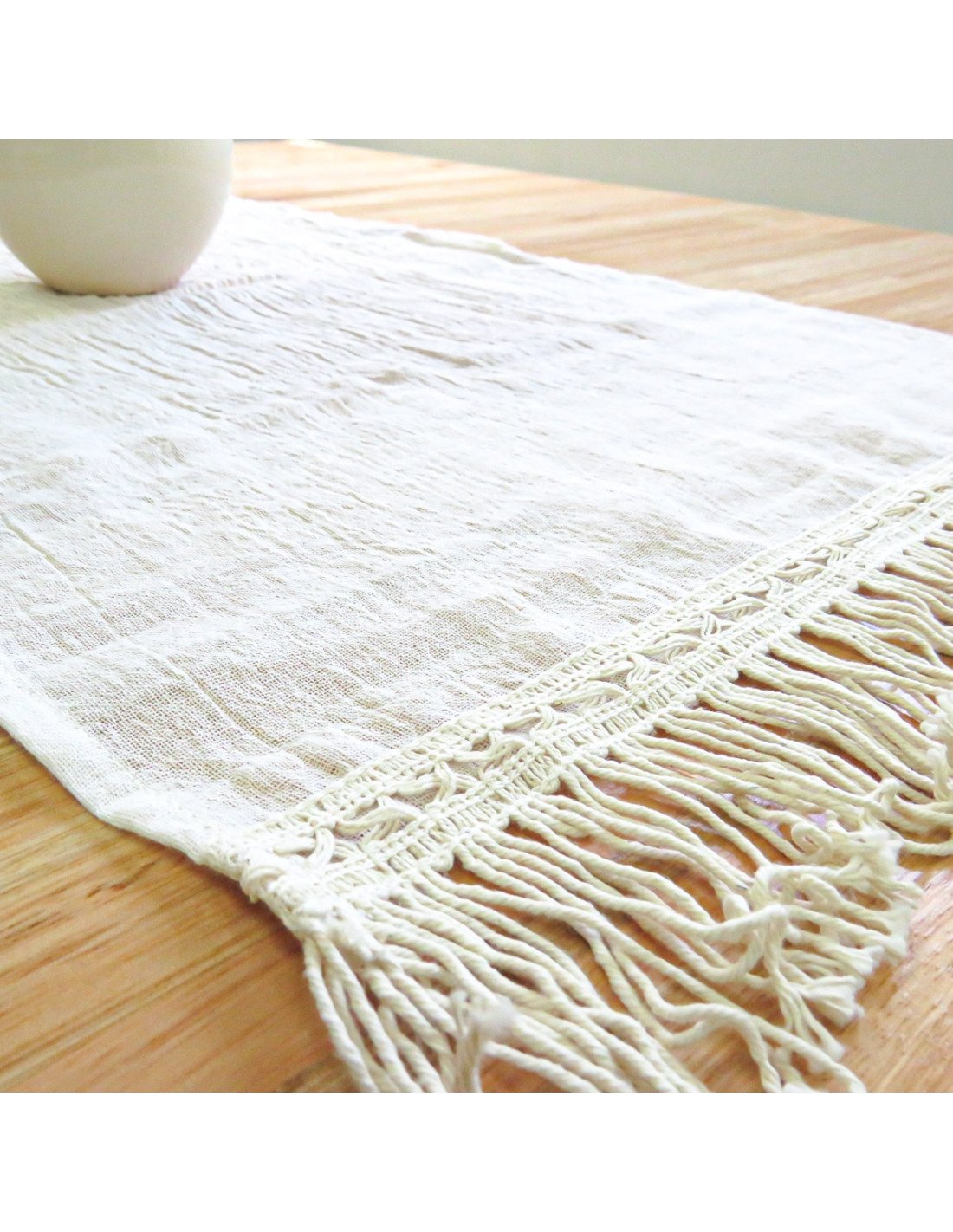 Camino de Mesa de 1,5 y 2,4 mts de largo en tela de gasa crudo con terminación de puntillas con flecos.