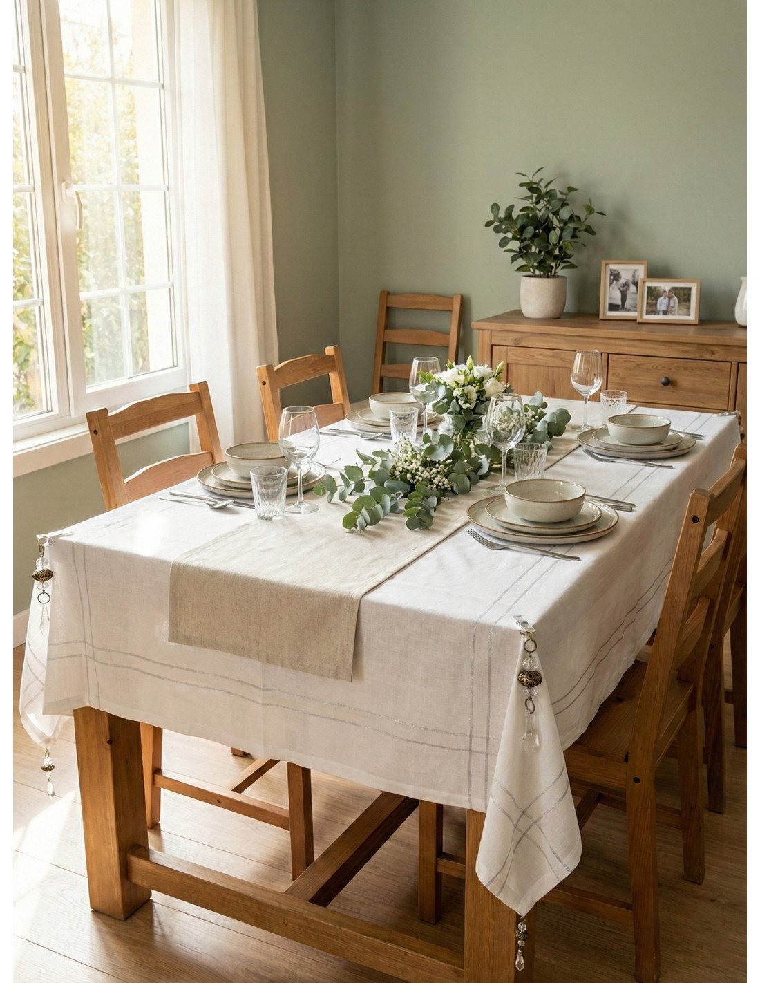 Mantel rectangular de tela de tusor blanco con rayas gruesas grises.